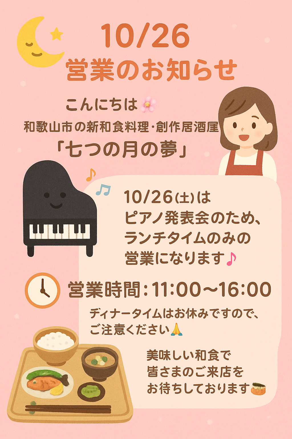 #お知らせ #和歌山市居酒屋 #和歌山の居酒屋 #和歌山市 #居酒屋 #創作居酒屋 #七つの月の夢 #新和食 #ランチ営業 #ピアノ発表会 #営業時間変更 #お知らせ #和食ランチ #美味しい時間 #和食好き #食べ歩き #季節料理 #おもてなし #ごちそうさま #ランチタイム #限定ランチ #和食グルメ #カフェ風居酒屋