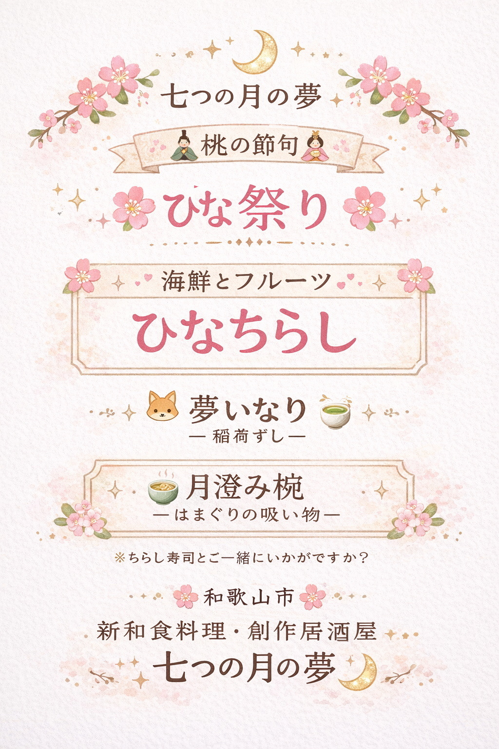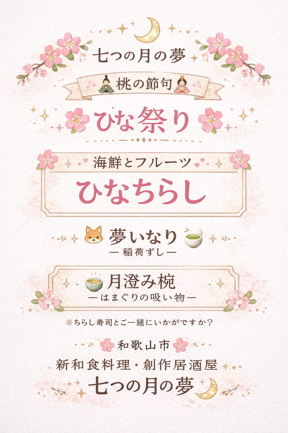 🏷 #お知らせ #キャンペーン #おすすめメニュー #雛祭り #桃の節句 #ひなちらし #ちらし寿司 #海鮮ちらし #フルーツちらし #夢いなり #稲荷ずし #月澄み椀 #はまぐりの吸い物 #春の和食 #季節の料理 #和食好きな人と繋がりたい #居酒屋 #創作和食 #和歌山市グルメ #和歌山居酒屋 #和歌山市居酒屋 #和歌山の居酒屋 #七つの月の夢 #春を味わう #日本の行事